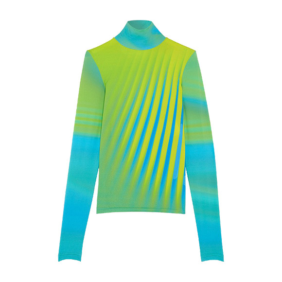 リサイクルポリアミドに凧をイメージしたアブストラクトプリントを描いたセカンドスキン感覚のトップ。