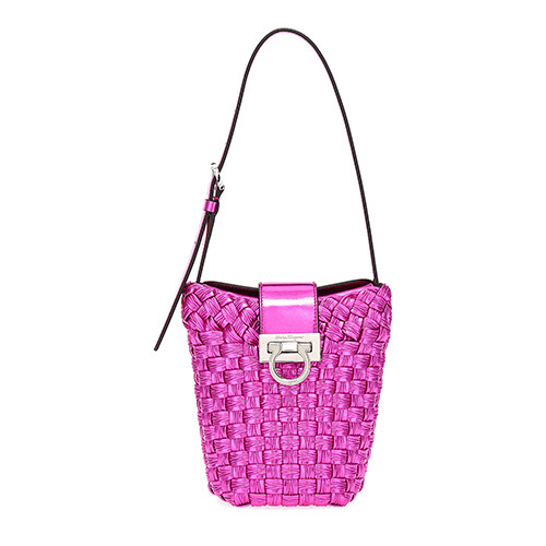 ブランドを象徴する「ガンチーニ」のクロージャーが目印の、「トリフォリオ」シリーズの新作。小ぶりながらフューシャピンクのレザー風ファブリックが存在感満点。