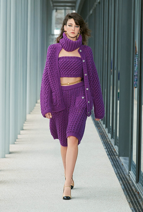 メティエダールコレクションで披露されたバルキーニットのセットアップは、ラグジュアリーなバイオレットとチャンキーな風合いがベストマッチ。