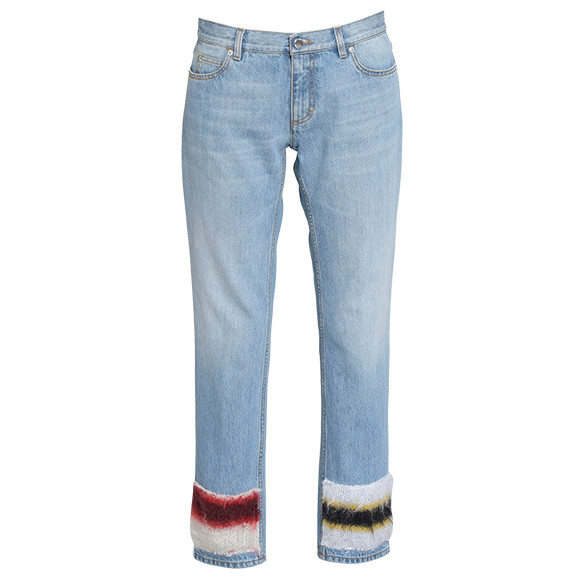 裾とバックポケット部分にカラフルなボーダーモヘアパッチを配したデザイン。