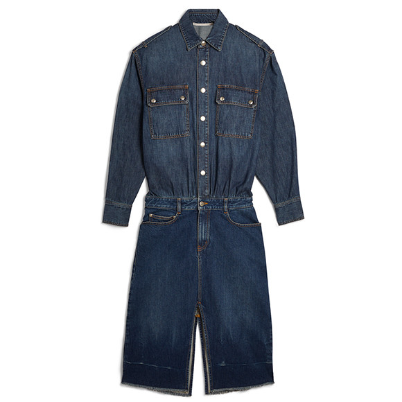 98%オーガニックコットンを使用したデニムをヴィンテージ風の風合いに仕上げたドレス。シャツとパンツのセットアップのようにも見えるディテールもポイント。