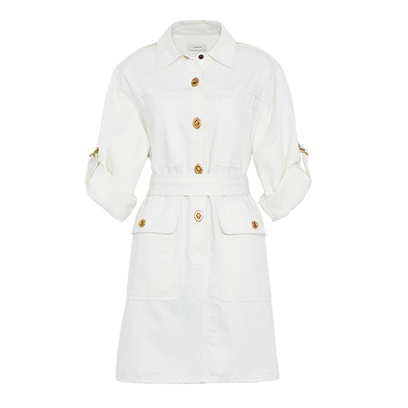 アイコニックなターンロック開閉のボタンが特徴的なデニムシャツドレス。袖はループ調節によってさまざまな丈で楽しめる。