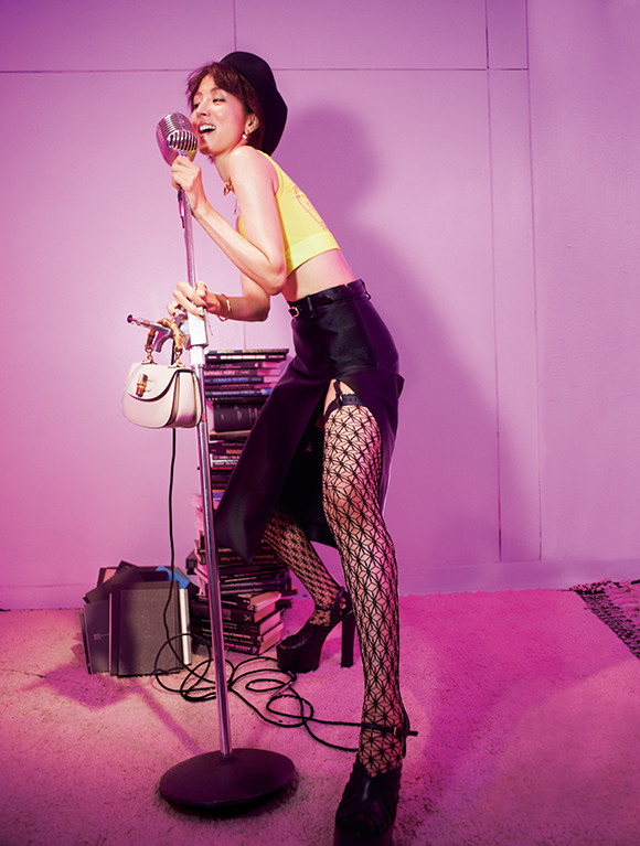 スポーツテイストのクロップトトップにセンシュアルなブラックのタイトスカートを合わせて。深いスリットから覗くフィッシュネットソックスが、すらりとした美脚をセクシーに演出する。新色グレージュのバッグ「グッチ バンブー 1947」は、使い勝手も抜群なスモールサイズをチェック。