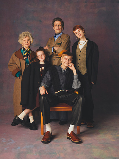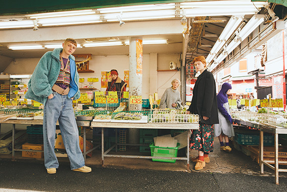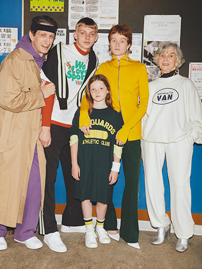 コラボレーションアイテムにフォーカスした5周年記念ビジュアルもポップアップストアで初公開。「Family Trip」をテーマに、日本を舞台に繰り広げる架空の家族をファッションストーリーに仕立てた。左(男性モデル):トレンチコート¥163,900 中央(女の子モデル):Van × アンスクリア コラボTシャツ¥25,300 右(女性モデル):Van × アンスクリア スウェットシャツ¥31,900、同パンツ¥31,900など/以上アンスクリア