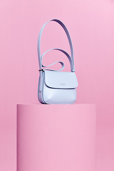 今回のポップアップでは、エコレザー仕様も初登場。色はホワイト、ピンク、画像のブルーの3色展開。バッグ「ジョルジオ アルマーニ ラ プリマ」(W20×H16×D12cm)¥214,500/ジョルジオ アルマーニ(ジョルジオ アルマーニ ジャパン)