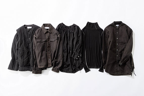 本ポップアップでは、京都紋付で漆黒に染め上げたアーカイブアイテムが勢揃いする。左から:ブルゾン¥46,200、ブルゾン¥25,300、ブラウス¥20,900、トップス¥13,200、シャツ¥20,900/以上ジョゼフ ストゥディオ