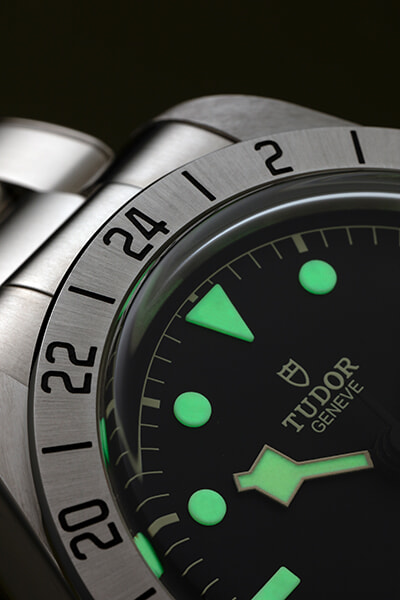 1969年に登場したチューダーのダイバーズウォッチの象徴である「スノーフレーク」針とともに、アワードマーカーも暗がりで発光するので、夜のアウトドアでも視認性は抜群。