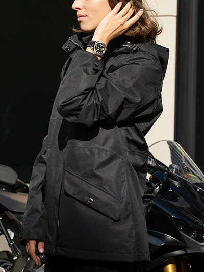 39mmサイズは存在感を放つが、女性が着用しても決して大きすぎることはない絶妙のバランス。冬ならスキーやスノボーなどのアウトドアスポーツ時にはもちろん、トレンチコートやダウンジャケット、シンプルなニットなどといったスタイルにも映える。