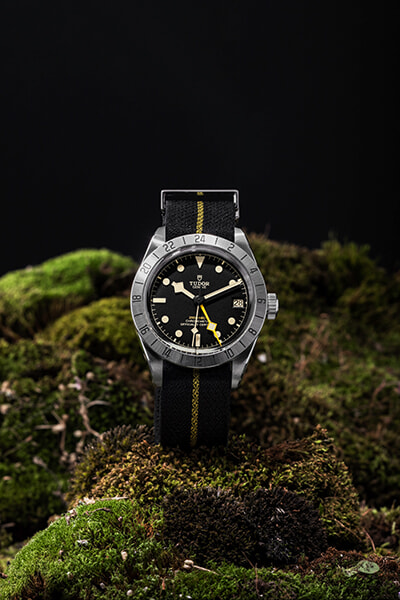 チューダーが2010年にいち早く取り入れた、老舗ジュリアン・フォール社の職人によるファブリックストラップ。「ブラックベイ プロ」では、イエローの「スノーフレーク」針と呼応するイエローのセンターライン入りのブラックファブリックストラップを採用。ウォッチ「ブラックベイ プロ」(39mm スチール製ケース ポリッシュ&サテン仕上げ)447,700/チューダー(日本ロレックス / チューダー)