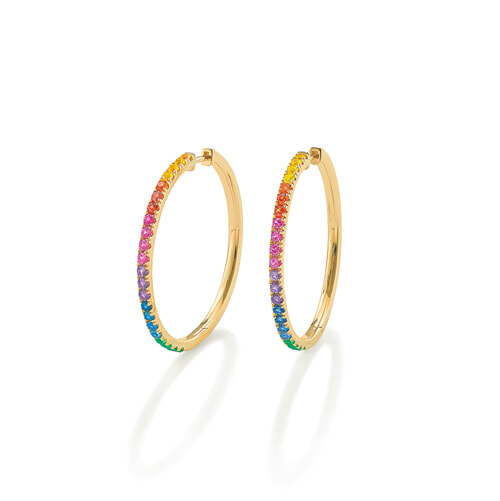 キャサリン妃がロイヤルウェディングで愛用したことでも有名なブランドからは、上品さを醸す虹色のフープピアス。華やかなトップに合わせたい。「ジャイアント オーブ フープ」(14KYG×サファイア×ツァボライト)¥825,000/ロビンソンペラム(オフィス クレセント)
