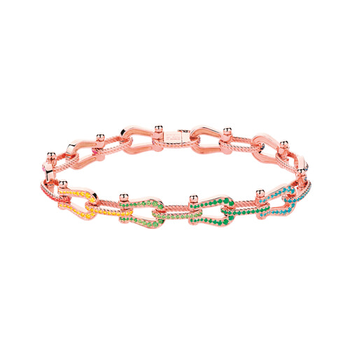 アイコニックなフォース 10のバックルがレインボーカラーで連なる。9つのエネルギーに満ちたプレシャスストーンを贅沢に使用。「フォース10ブレスレット」ミディアムモデル(PG×カラーストーン×ダイヤモンド)¥3,861,000/フレッド(フレッド カスタマーサービス)