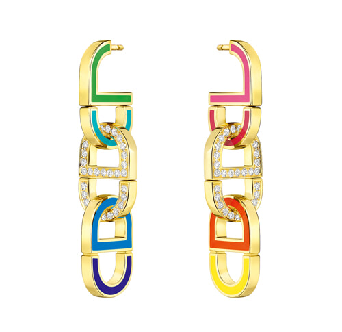 大胆な色使いでゴールドのCDを彩る。中央にはパヴェダイヤモンドをあしらい、エレガンスも兼ね備えた遊び心あふれるイヤリング「カラーディオール」(YG×ラッカー×ダイヤモンド)¥2,300,000/ディオール ファイン ジュエリー(クリスチャン ディオール)