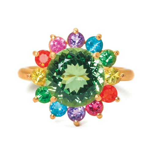 ひときわ大きなグリーンのトルマリンをぐるりと囲んだレインボーの色石たち。互いを引き立て輝き合う、石が主役のリング「オルテンシア」(20KYG×グリーントルマリン×レインボーカラーストーンズ)¥716,100/マリーエレーヌ ドゥ タイヤック(エムアッシュテ)