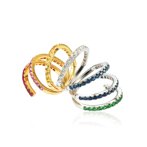 まるで7つ重ね着けしたような、らせん状のデザインが魅力。指先に虹を纏うようなマジカルな体験を。「レインボーコネクタリング」(YG×WG×サファイア×ルビー×グリーンガーネット×ダイヤモンド)¥1,320,000/ミオ ハルタカ(ミオ ハルタカ ギンザシックス)