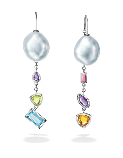 アシメトリーにレイアウトされたカラーストーンを、有機的なフォルムが魅力のバロック南洋真珠が受け止めて。「バロックパール ピアス」(WG×バロック南洋真珠×ブルートパーズ×ピンクトルマリン×シトリン×ペリドット×アメシスト)¥844,800/タサキ