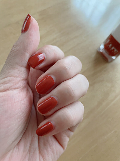 最後はパリ発のエコでナチュラルなネイルカラーブランド「キュアバザー」から1本。常日頃からオレンジ系のカラーのマニキュアを買いがちなのですが、冬ならビビッドよりもやや重めなカラーを塗るのが気分。こちらは発色抜群なので、1度塗りでこの仕上がり! 赤みのあるオレンジでかなり目立つので、アクセサリーなしでも華やかな手元にしてくれるところがお気に入りです。発色がいい分、剥げるとちょっと目につくので、時間があるときにササっと重ねて応急処置を。