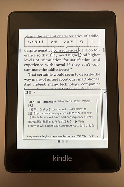 しかし! Kindleだと英単語を長押しするとその意味を検索してくれる機能があるのです。改めて辞書で単語を調べ直すという必要もなく、ページ内で完結できるのでストレスが軽減され、自信を持って完読することができます。それに加え、読解アシストをしてくれるのがAudible。本1冊を聴けるこのアプリは、もちろんネイティブスピーカー(たまに作者が参加してくれるのも嬉しい)が抑揚をつけて読み聞かせてくれます。耳と目からの英語で理解のWパンチ!