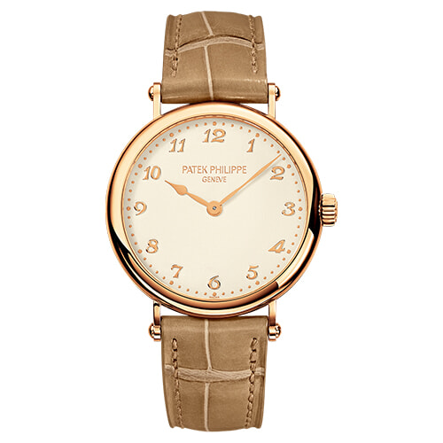 ペア型針やブレゲ数字のインデックスを配した古典的な意匠。シンプルなデザインとローズゴールドの柔らかな色彩が美しい。(RG×アリゲーターストラップ、φ34.6mm、自動巻き)¥4,136,000/パテック フィリップジャパン・インフォメーションセンター