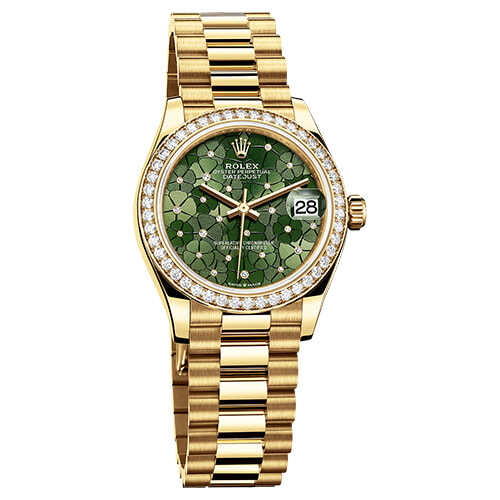 文字盤装飾においても優れた職人技を反映した「デイトジャスト」。サンレイとマット、グレインの異なる3種の仕上げにより浮かび上がるフローラルモチーフが、艶やかさを見せる。(YG×ダイヤモンド、φ31mm、自動巻き)¥4,925,800/日本ロレックス