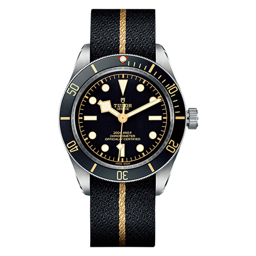 コレクターから“スノーフレーク”と呼ばれる針もチューダーのシンボル。ブラックに添えたゴールドカラーのミニッツマーカーもアクセントに。200mの防水性を誇る。(SS×ファブリックストラップ、φ39mm、自動巻き)¥464,200/日本ロレックス / チューダー