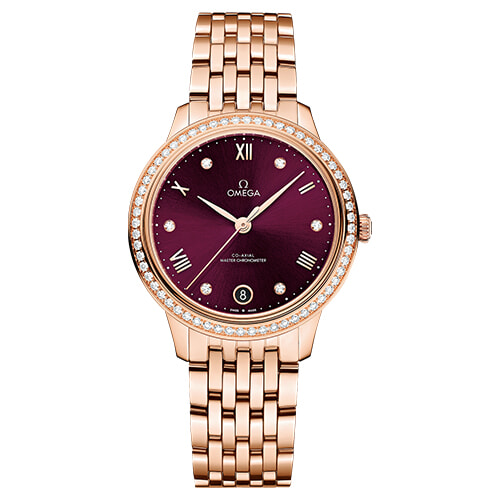 パープルバーガンディ文字盤とゴールドの調和が見事。文字盤に施された放射状のサンブラッシュ仕上げが、繊細で上品な輝きを放つ。(セドナ™ゴールド×ダイヤモンド、φ34mm、自動巻き)¥4,543,000/オメガお客様センター