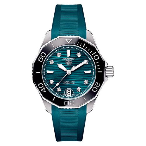 F1グランプリにおける公式タイムキーパーの歴史とともに、タグ・ホイヤーはモータースポーツと縁の深いブランドとして名を馳せてきた。同様にさまざまな分野のスポーツウォッチを手がけてきたことでも知られているが、高い防水性を誇るダイバーズウォッチのラインナップが「タグ・ホイヤー アクアレーサー」だ。300m防水となる新作では既存のデザインコードを守りながら、従来のアルミニウムからセラミックに変更した逆回転防止ベゼルなど、ダイビングのための機能性が高められた。かつ、目覚ましいのが鮮やかなグリーンカラー。視認性の高い八角形のインデックスにはダイヤモンドがあしらわれ、王道のダイバーズモデルがよりレディライクにアップデートされた。
