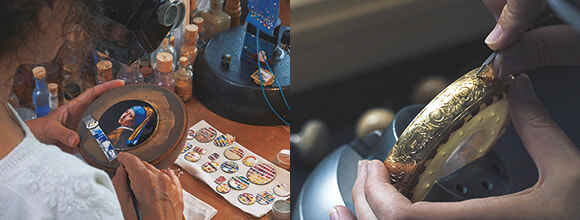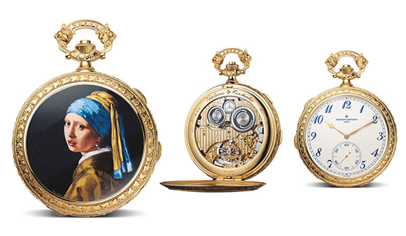 ここに一例として、ヴァシュロン・コンスタンタンの時計を挙げてみよう。同社はスイス・ジュネーブとジュウ渓谷の工房で、18世紀から続く時計製作の伝統を守り続けてきた。自社一貫体制で製作を行うマニュファクチュールとしても知られている。かつヴァシュロン・コンスタンタンは、永久カレンダーやムーンフェイズ、トゥールビヨンなど、いくつもの機構を組み合わせた、複雑機構の名手として活躍してきた。そんな伝統の技術力を結集させたのが、「レ・キャビノティエ・ウェストミンスター・ソヌリ -ヨハネス フェルメールへ敬意を表して- 」である。これはある顧客の願いから誕生した、特注のユニークピース。美しいメロディを奏でる“ソヌリ”に加えて、フェルメールの名画を再現したミニチュア・エナメルや、芸術作品のような彫金など、各分野における最高峰の職人技が注ぎ込まれているのだ。