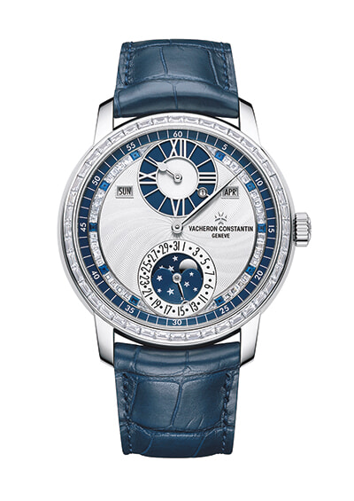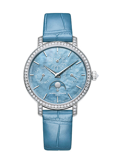 ブルーグレーのマザーオブパールが美しい。ムーンフェイズも同色に仕上げられ、見事な色の調和を見せる。(WG×ダイヤモンド×MOP×アリゲーターストラップ、φ36.5mm、自動巻き)¥12,496,000/ヴァシュロン・コンスタンタン