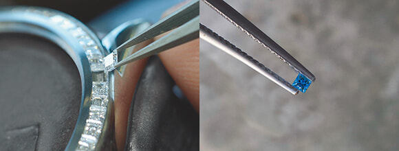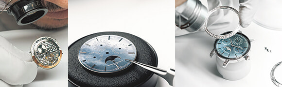 “レ・キャビノティエ”とは、18世紀に時計師たちが自然光が入る屋根裏部屋キャビノティエを作業場にしていたことにちなむ。時計師は技術はもちろん天文学にも精通した知的レベルの高さで尊敬されていた。同社では現在ビスポーク製作部門の呼び名に。パーペチュアルカレンダーは男性用だが、見事なジェムセッティング(写真下左)は必見。ヴァシュロン・コンスタンタンは自社内にジェムセッターを抱える貴重なブランドで、5分ごとに配置された10ポイントのサファイアも美しいアクセント(下右)。