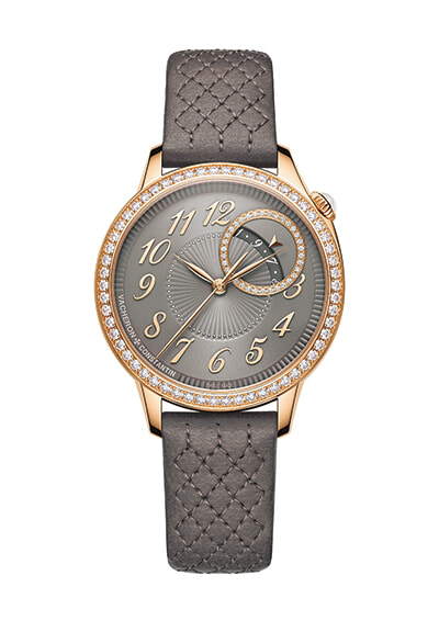 2時位置にディスク式の日付表示を配したデザインが個性的。新色はコレクション初のトープカラーだ。インターチェンジャブルストラップ仕様。(PG×ダイヤモンド×キルティングラムスキンストラップ、φ35mm、自動巻き)¥4,444,000/ヴァシュロン・コンスタンタン