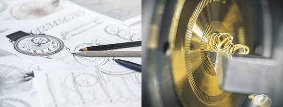 テーマとなったのは、「オートオルロジュリー(高級時計)とオートクチュール」の融合。オフセンターのレイアウトをベースに、スカートのようなプリーツ模様や縫い針のように細い秒針など、クチュール仕立てをイメージしたファンタジックなデザインを考案(写真下左)。文字盤に施されたのは、手動旋盤を回して文字盤に加工を施す伝統的なギヨシェ彫りと同様の“タペストリー技法”(下右)。工房の伝統的な機械を用いて、職人が手作業で彫りを施している。