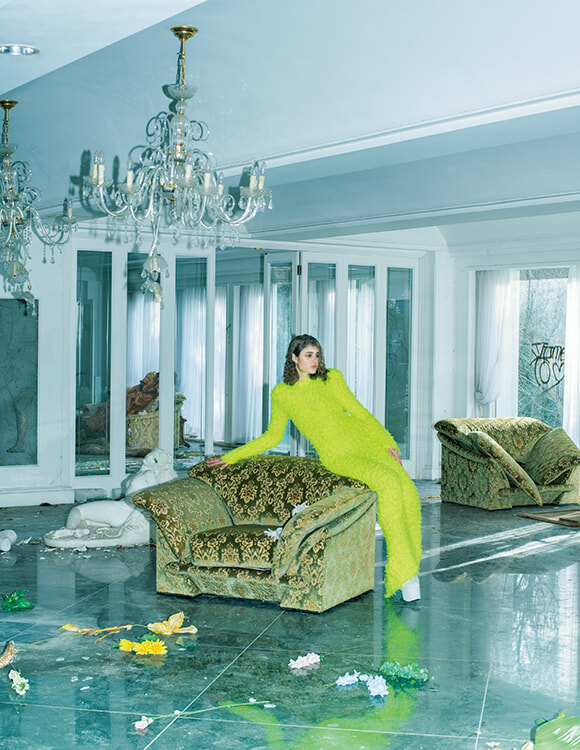 ローゲージのシャギーヤーンで編んだニットのロングドレス。パリシックなミリマリズムが宿るニットドレスが、フラッシーなネオンイエローではっとするほど新鮮に生まれ変わった。張り出したショルダーで、強い主張を感じさせて。