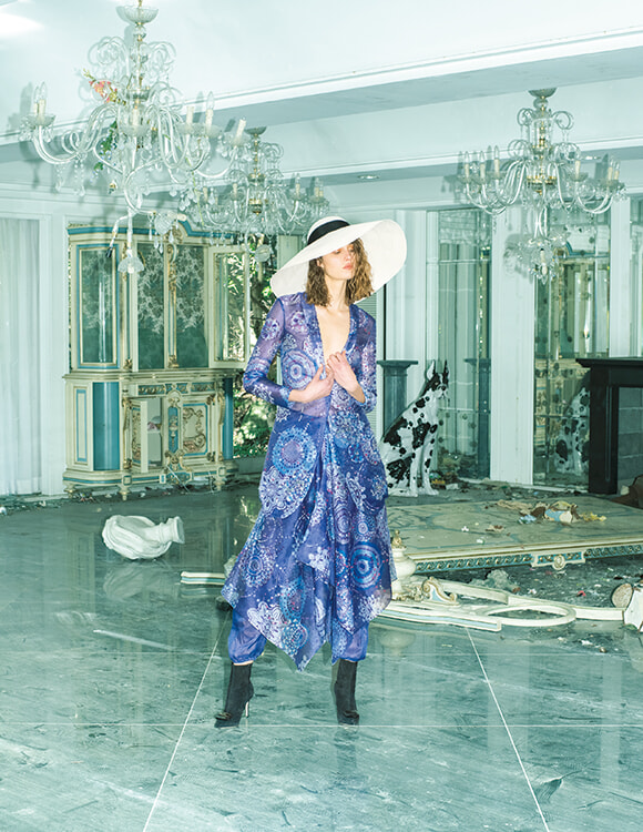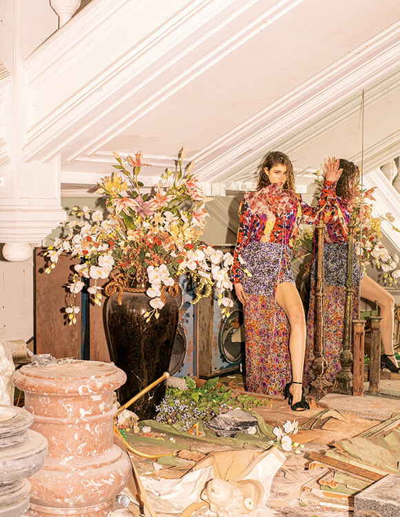 アーカイブを再解釈し、拡大したり縮小したり、さまざまなフローラルプリントを透け感のある素材に組み合わせた華やかなピース。弾けるような色と柄の組み合わせが、ドレスアップのシーンにオプティミスティックな彩りを添える。