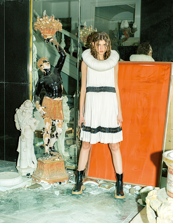 ディテールを拡大し、大きく折りたたんだプリーツが揺れる、ユニークなドレス。シルクシフォンとレザーの素材のコントラストに、メゾンならではのクラフトマンシップが息づく。固定概念を軽々と飛び越える、タフな一着。