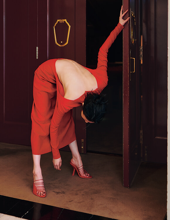 ドレス¥737,000、サンダル¥137,500/ともにフェラガモ(フェラガモ・ジャパン)