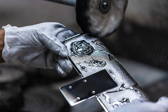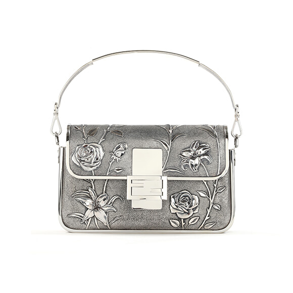今年は「ハンド・イン・ハンド」の一環として、イタリアを飛び出しアメリカ・ティファニーの銀細工職人たちと協業。イタリアの国花・ユリと、ニューヨークの州花・バラを彫り込んだスターリングシルバーの限定版「ティファニー バゲット バッグ」をつくりあげた。