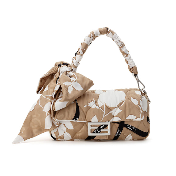 フェンディのアーカイブから発掘したフローラルプリントと、「バゲット」初のディテールとなる大きなリボンが特徴。リボンを編み込んだハンドルや本体に施された幾何学的なステッチなど、細かな部分にまでこだわりが感じられる。