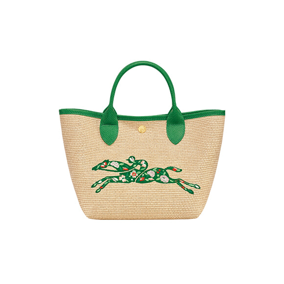 これからの季節に活躍させたい、キャンバス地をストロー風に仕上げた軽やかなデザイン。昨年の春夏にデビューして好評を得たかごバッグ風の「ル プリアージュ®」が、今季はひと回り大きなサイズになって登場。小花柄を全面にあしらった“ロンシャン・ホース”の刺繍が目を引く。肩掛けやクロスボティにできる取り外し可能なストラップ付き。