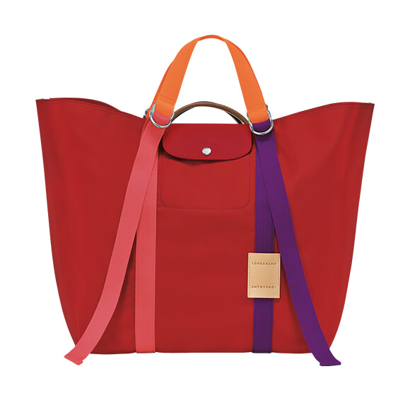 「ル プリアージュ® リプレイ」は昨年秋冬シーズンにローンチした新ライン。ロンシャンのアトリエに眠っている素材を廃棄せず最後まで使い切ることを目的とした、サステナビリティに配慮した取り組みだ。第2弾の今季は、端材を組み合わせたカラフルなトートが誕生。長さの調整ができるハンドルを採用しており、肩掛けも手持ちも可能。