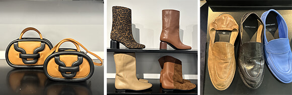 左から、ころんとしたフォルムが愛らしい新顔のアルファパッド。バイカラーで色のバリエもさまざま。くしゅくしゅとたるませてはくブーツは来シーズンの足元トレンドのひとつ。バブーシュ風にかかとをふんでも履けるモカシンが登場。