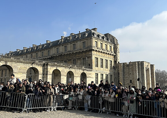 お天気にも恵まれて予想よりは暖かなパリ。森を抜けて会場に到着すると、エントランスはすでに大混雑。このところコレクションの風物詩となった入り待ち・出待ちのファンがここまで押し寄せている。彼らのお目当てはNCTのテヨンとロエベのグローバルアンバサダーに抜擢された韓国の次世代ガールズグループNMIXX。ものすごい嬌声があがるので、広いお城の中庭にいても彼らが到着したのがすぐにわかる。フロントローに座る前に、指定の場所でフォトコールに応じるのも彼らのお仕事。運良く彼らの入りをキャッチできたのですが、カメラマンの数もすごくて、こんな写真になってしまいました。