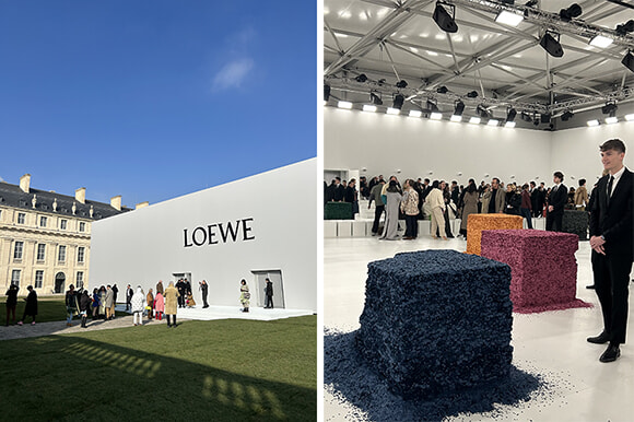 そんな喧騒はさておいて、ロエベです。会場であるヴァンセンヌ城(Chateau de Vincenne)の中庭に設置された白いキューブの中に入ると、さまざまな色のキューブがランウェイにランダムに設置されています。イタリア人アーティスト、ララ・ファヴァレットの作品で、素材はなんと紙吹雪。接着剤などは使わず人の力で圧縮してこの形を作り上げているということ。なのでそのキューブの近くで人が動くと振動で自然に崩れてくる。動きや時間の経緯によるそうした作品の変容も狙いのひとつのようです。
