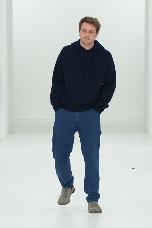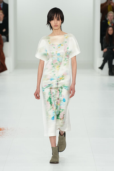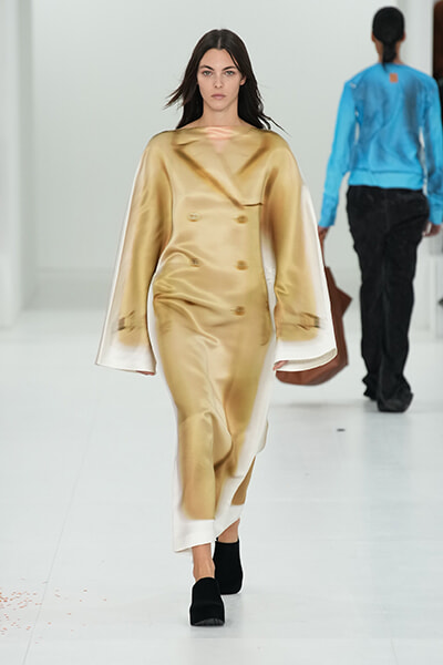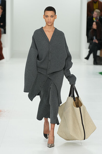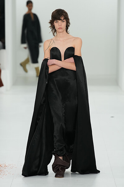 ショーノートで今回のコレクションはその前のメンズから続く「the reductionist act(還元主義的実践)」の継続と語っているクリエイティブディレクターのジョナサン・アンダーソン。Reductionという言葉は23春夏のショーノートでも使われていましたが、日本語にすると削減、縮小、還元、単純化などの意味があります。動詞のReduceというワードもしばしば使われていて。還元主義についてはいまひとつ理解できていないのですが、あらゆるものを削ぎ落とした先に残る洋服の本質を彼は探求しているような気がします。だから、シルエットにフォーカスし、素材にフォーカスし、そしてそれを着る人の動作にフォーカスする。シャツやパンツ、テーラードコート、シフトドレスなど基本的なアイテムのみで構成されているのもReductionの結果ゆえ。そのうえでたったひとつのアイデアでそこに新しいプロポーションを加えていく。大きなボタンで留めただけのドレープドレスやコンパクトに成形されたレザージャケットもそのことを体現しています。引き算して再設計することで服のリアリティを問い直すというReduction。そうした純化を突き詰めながら、まだ見えないファッションの未来を追い求めている。そんな思いが伝わってくるアンダーソンのクリエイションにはこれからも目が離せません。