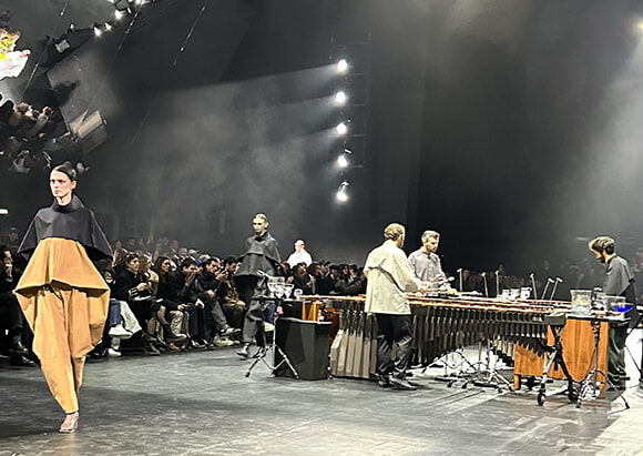イッセイミヤケのショーは毎回ライブの音楽にのって。今回はマリンバの生演奏。