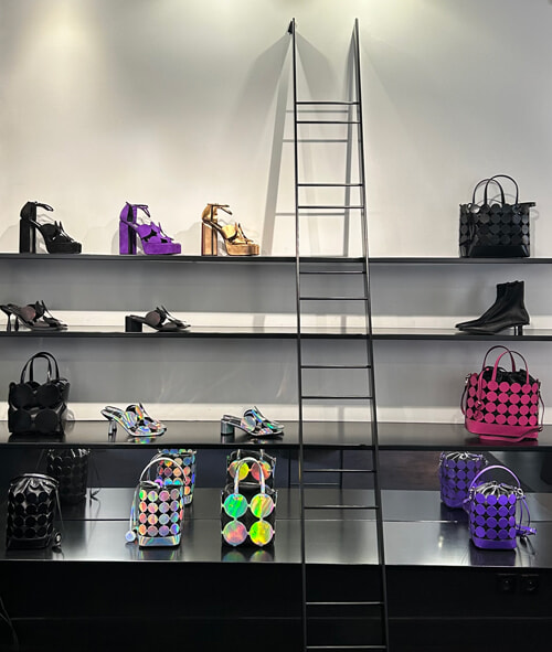 シルバーやパープルの新カラーがお目見えのビュル バケット。同じモチーフのミュールがちょっと気になる。