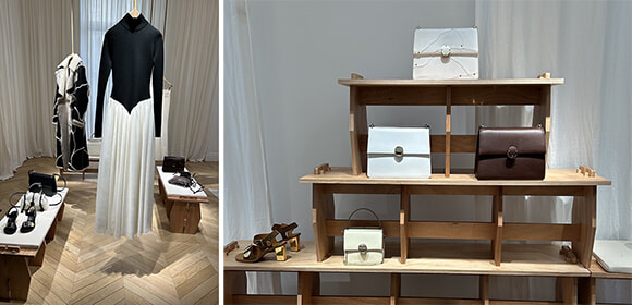 前日のショー会場のベンチを棚としてリユースしたクロエのRe-seeの展示風景。ランウェイに登場したモノトーンのドレスから新アイコンバッグのペネロペまで来シーズンのニューフェイスがずらり。