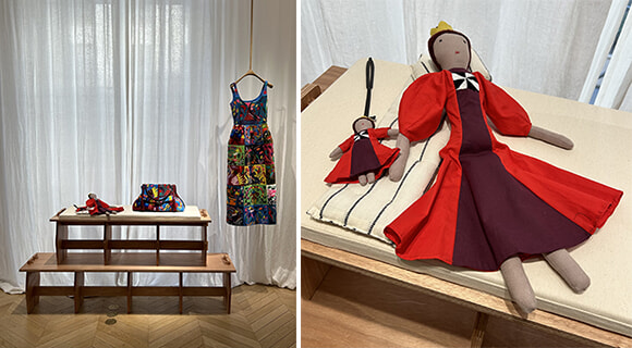 17世紀のバロック画家、アルテミシア・ジェンティレスキをミューズに、女性の手によるルネサンスを提案したクロエ。ショールームには黒と白がキーカラーの優雅なドレスからクールなレザーのコートやパンツが並んでいます。春夏にデビューしたペネロペバッグもルネサンス風のメタルコインの留め金でブラッシュアップ。ひと際目を奪われるのが、アルテミシアの絵画にもなった寓話を描いた総刺繍のドレス。インドのムンバイにある女性の就労支援のための刺繍工房「チャナキヤ・インターナショナル」の手によるスペシャルアイテムということ。CO2削減から女性支援まであらゆる社会問題に積極的に取り組むクリエイティブディレクターのガブリエラ・ハーストの活動はますます広がっているよう。その隣には、アフガニスタンの難民支援のための社会企業「シライワリ」が端切れを使って手作りしている人形が置かれて。このRe-seeの展示にはショー会場のベンチがリユースされていましたが、さらにブティックで使用された後にチャリティに寄付されることが決まっているそうです。