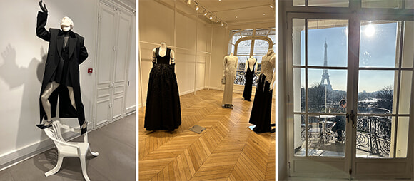 ジバンシィでは今回のテーマである「新しいエレガンス。グラマーの現代的な研究」にリアルに触れて。クリエイティブディレクターのマシュー・M・ウィリアムソンのストリートのクールネスと前シーズンからスタイリストとして加わったカリーヌ・ロワトフェルドのパリのシックがうまく融合されている気がします。スクエアな肩にウエストをシェイプしたテーラリングのロングコートがカッコいい。なによりもショールームに入るとすぐに展示されていたイブニングドレスの美しさといったら。プレタとはいえ、すべてクチュールのアトリエで製作されているとか。このショールームで毎回思わず写真撮影してしまうのが窓から見えるエッフェル塔。こんな眺めのいいテラスで仕事の合間にひと息つけるなんていいなあ。