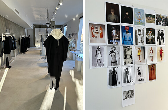 アンドレ・クレージュ氏自身がデザインしたというショールーム。壁に貼られている今回のコレクションのムードボードにも当時のルックが参照されている。