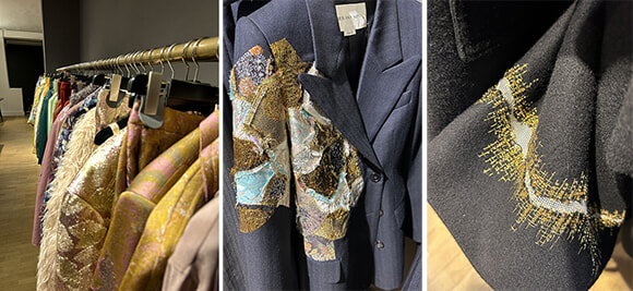 ショールームの両サイドにサンプルがぎっしり。繕ったり当て布をして大切に着るという服への愛をドリスならではの詩的なディテールで表現。